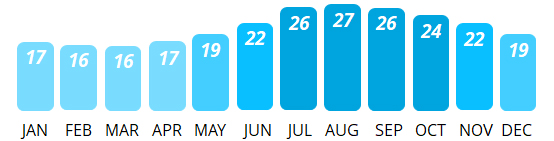 바다는 한겨울에도 16도 이하로 떨어지지 않기 때문에 기술적으로는 일년 내내 수영을 할 수 있지만 해가 갈수록 더 즐거워집니다. 5월에는 여전히 '신선'하지만 6월에는 22도(실내 수영장 온도 기준)에 도달하고 8월에는 초대형 27도에 도달합니다.