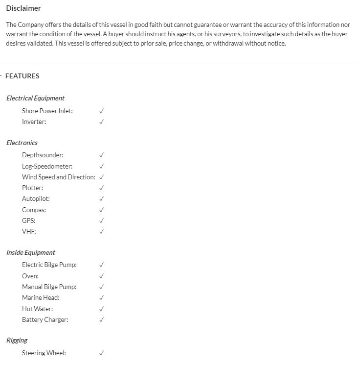 상세 내역에서는 요트의 총 길이, 흘수(수면에서 요트 하부까지의 길이, 물 속에 잠겨 있는 수직 길이, draft), 메인셀 빔의 길이, 공차중량, 워터탱크 용량, 기름통 용량 그리고 침실의 갯수와 최대 승차 정원을 확인 할 수 있다.
