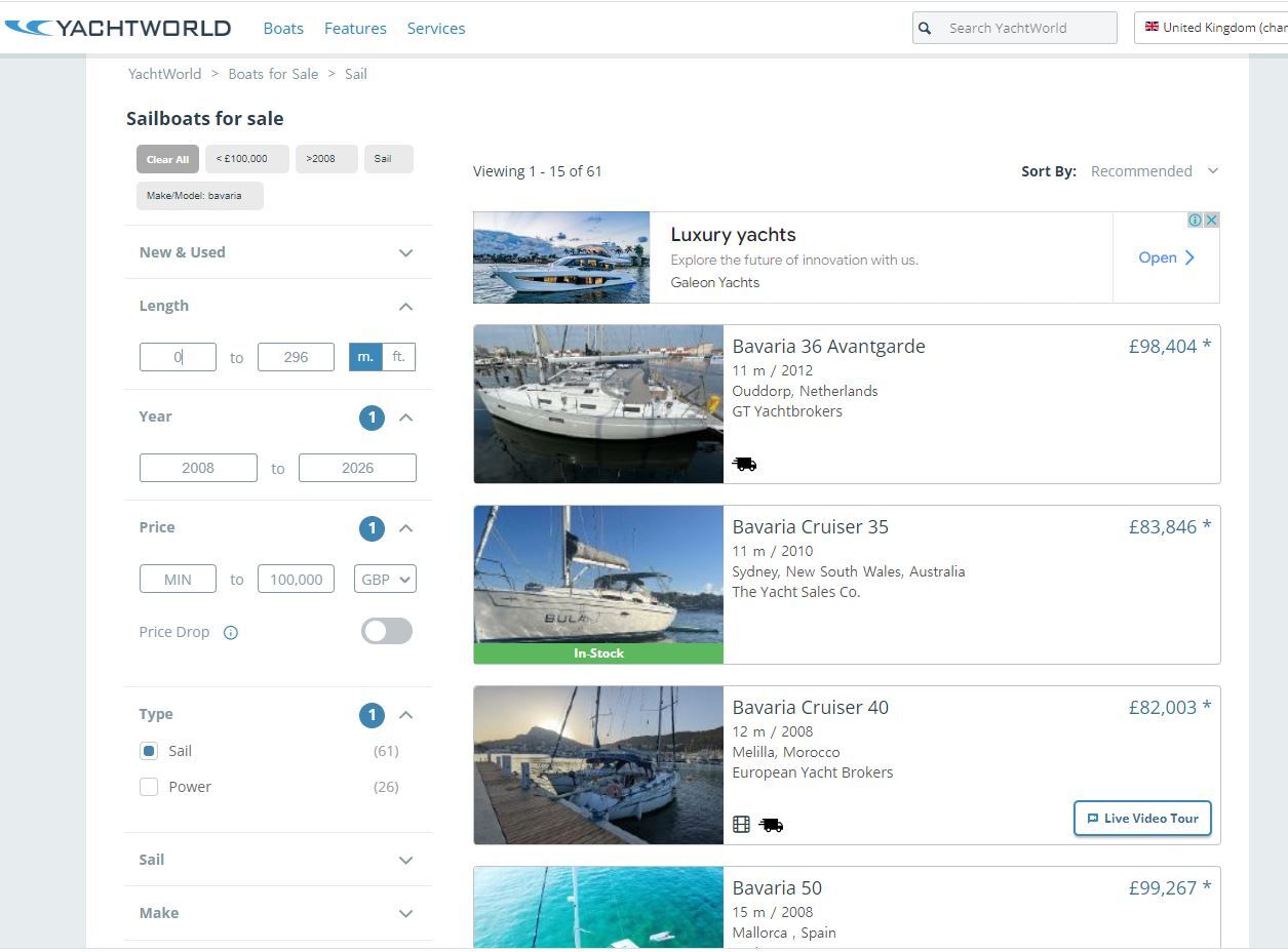 요트의 길이를 40피트 이상, 2008년식, 10만 파운드 이하로 필터링 하고 검색된 매물을 확인하다. 이곳 사이트는 전 세계 요트를 판매하는 브로커, 혹은 중개사가 올린 매물이 대부분이다. 새요트도 있고, 광고 매물도 있다.